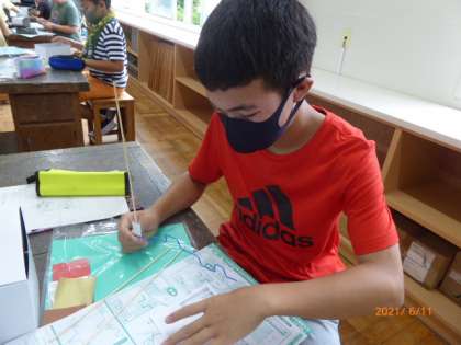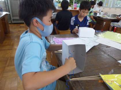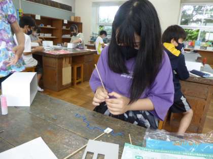 6年1組が図工で「くるくるクランク」の制作に入りました。まずは内部の仕組みからです。クランク軸を箱の中にセットして、軸に支柱を立てていきます。支柱の先に取り付けるキャラクターはこれからですね。