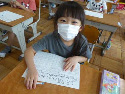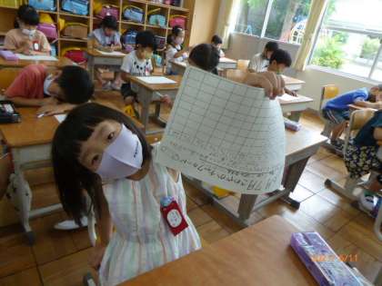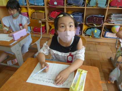 保健委員会の発案で、全校で「さわやかチェックカード」に取り組んでいます。早寝早起き、歯磨きなど健康な生活を送れているか自分で振り返ります。1年1組でチェックカードに〇を書き入れている様子です。
