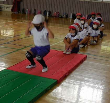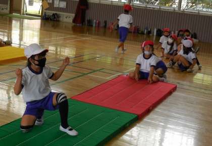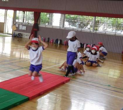 1年生の体育の時間です。自分でつくったお話をマットの上で表現します。