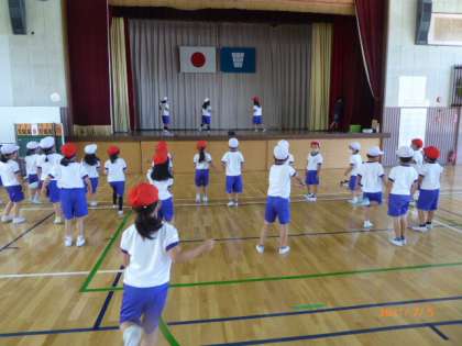 1年生が体育館で踊りの練習をしています。これは「なわとびダンス」の曲ですね。得意な子が3人ステージの上でお手本になって、それを見てみんながまねをしています。