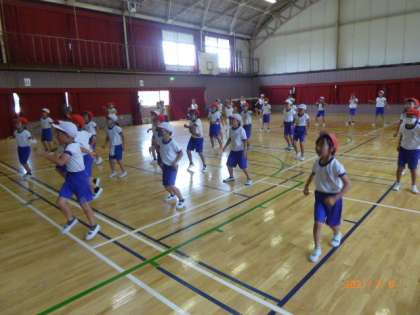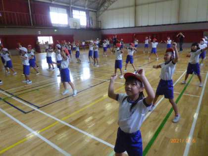 体育館からにぎやかな音楽が聞こえてきます。2年生が動画を見ながらダンスを練習しています。この曲は「紅蓮華」ですね……アニメ「鬼滅の刃」の曲です。