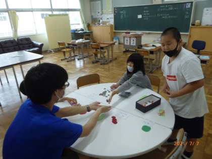 なかよし学級は、収穫した野菜を職員室で販売する計画を立てています。お客さんと店員さん役に別れて販売のしかたやお金の取り扱い方について練習しています。