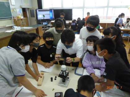 6年1組は顕微鏡を使って、葉にある小さい穴を観察しています。先生が映像をスマホで撮影しようとしています。撮れた写真を見せてくれました。これを電子黒板に映し出せば大きく拡大された映像で確認できますね。