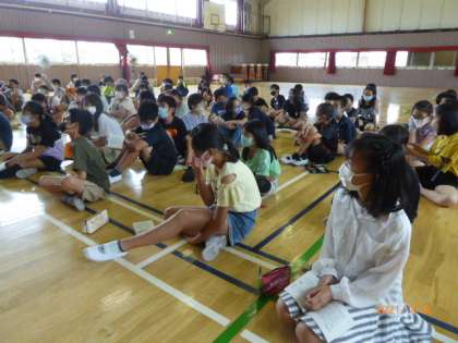 5年生が体育館に集まって林間学校に向けて説明を聞いています。カレーライスをうまく成功させるためのコツについてのお話ですね。じゃがいもの皮むきや、芽をとることなどの確認もしています。