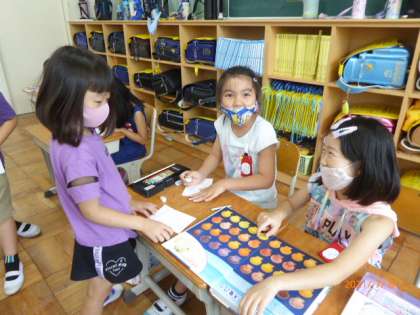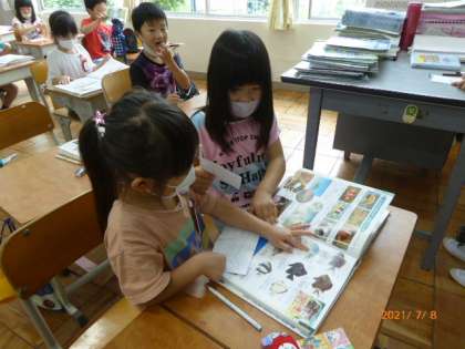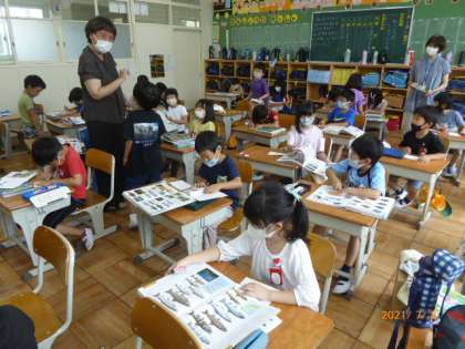1年生も「海の絵コンクール」の作品を製作中です。図鑑を見ながら魚や貝の絵を描いています。