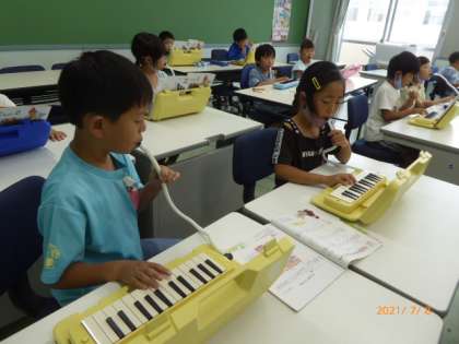 2年2組の音楽はクーラーの効いたコンピュータ室で行っています。大きな音が出ても他のクラスへの迷惑がかかりません。姿勢良く「かっこう」を演奏してくれました。