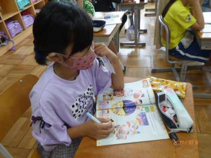 4年2組の外国語活動の続きです。動画を見終わってから、「もう一回、見せて〜」と盛り上がりながらがんばっています。