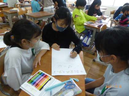 今日の委員会活動の様子です。給食委員会は残さず食べるよう呼びかけるポスターを作っています。総務委員会は運動会の大玉送りについて競技名を話し合っています。保健委員会は呼びかけをするときに使う透明のタスキを制作中です。