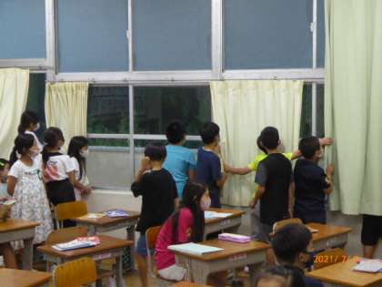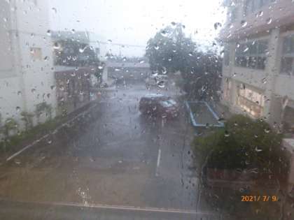 給食後からみるみる空が暗くなり、雷とともに激しい雨が降り出しました。どの教室も児童が外を見ています。