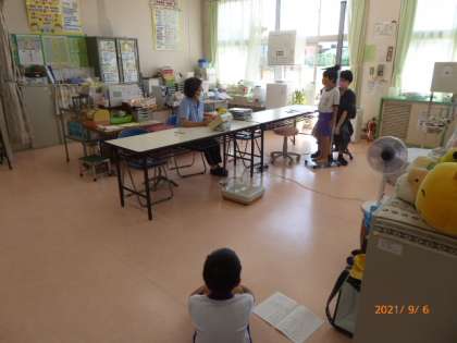 1年生が身体測定をしています。保健室の前に静かに並んで座り、上履きと靴下を脱いで待っています。順番に慎重と体重を測ります。どれだけ大きくなったかな?