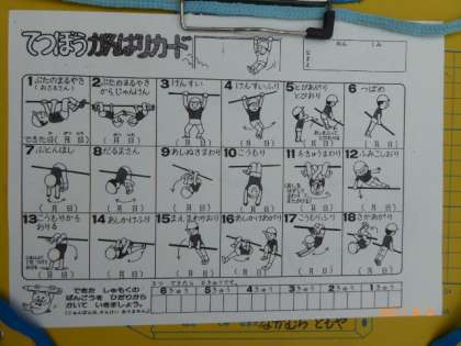 4年2組は体育で鉄棒をしています。「がんばりカード」にはとてもたくさんの技が描いてあります。