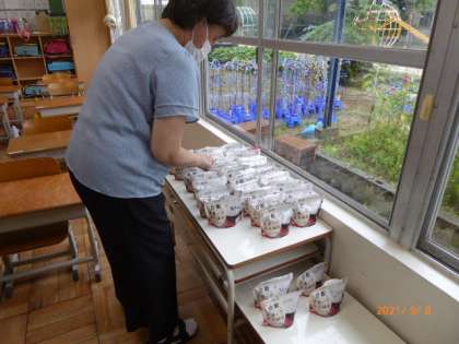 今日の給食は非常食体験です。アルファ化米を食べられるようにするには、お湯で15分、水なら60分間、つけておかなければなりません。大放課に各自で、ペットボトルの水を170ml、アルファ化米の袋に入れました。テーブルやロッカーの上に並んでいます。