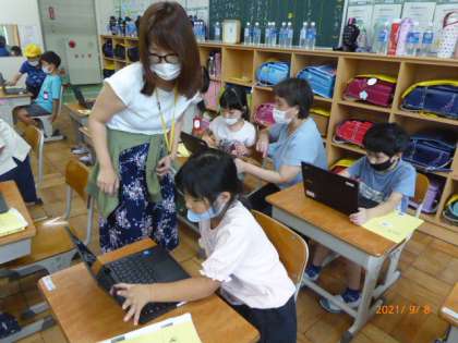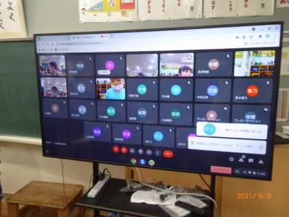 1年生の「先生とつながろう」の続きです。先生のタブレットからの映像送信の準備をしていますが、なかなかうまくいきません。児童側はマイク機能をoffにしなければなりませんが、誰かが間違えてonにするたびに、全体に送る映像が切り替わってしまったり、ハウリングが起こって教室中にすごい音が響いてしまったり……悪戦苦闘中です……