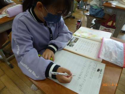 3・4年生で習う「外国語活動」は「聞くこと」や「話すこと」が中心で、英文を読んだり書いたりすることはありません。それに、英単語のつづりと、日本語をローマ字で書き表すことは違います。なので、この「ローマ字」は国語の勉強になります。みんなとても上手にアルファベットが書けています。