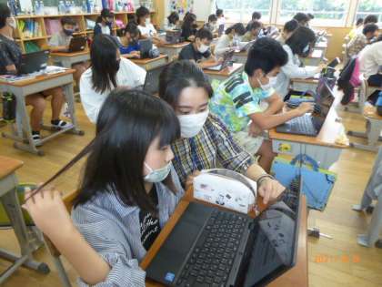 6年2組は「ジャムボード」を使って、理科の食物連鎖についてまとめています。陸上での食物連鎖を例にして、海での食物連鎖について、タブレット上で付せんをはったり、そこを線でつないだりしています。