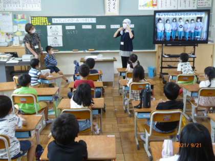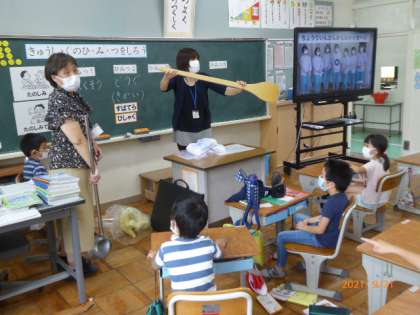 1年生で、4時間目に食育の指導を行いました。給食センターから栄養教諭の先生が来てくださいました。給食の秘密を5つ、紹介してくださいました。