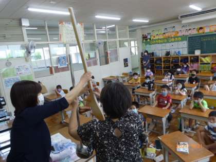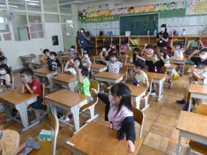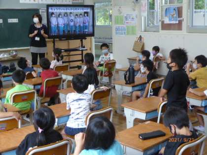 1年生の「給食の秘密を知ろう」の続きです。献立にはいろいろな工夫があって、今日は十五夜だから「月見だんご」が出ることや、七夕の時には「七夕ゼリー」だったことも教えてもらいました。1年生なので、栄養についての詳しい話はありませんでした。