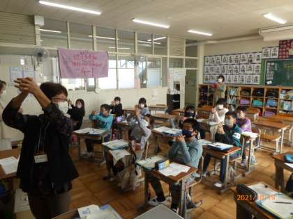 4年生の福祉実践教室の様子です。認知症の方との接し方の続きです。認知症になることを防ぐための運動についても体験しました。
