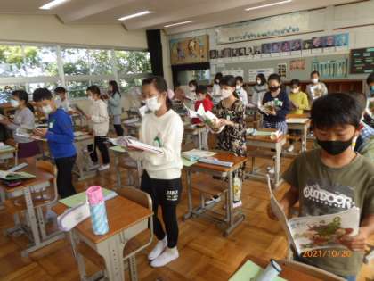 4年1組は音楽で歌を歌っています。ようやく歌うことが解禁になりましたね。曲は「もみじ」です。歌い始めはとてもやさしく、小さな声で、そしてだんだんと大きく力強く歌い上げていきます。何人かはゆっくり体を揺らしながら歌っています。響きがとってもきれいです。歌声の出し方をみんなよく知っているなあと感心します。