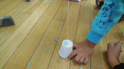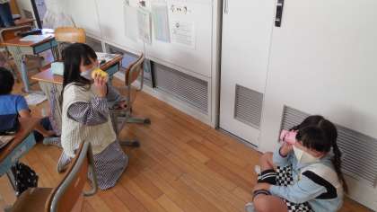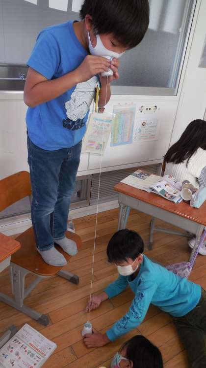 3年生の理科の時間です。音が伝わるときの様子について、糸でんわを使って調べていました。糸をぴんとはって声を出すと、もう一方の紙コップの受話器で声をきくことができました。音が伝わるときには、受話器の紙コップがふるえていることをおはじきの動きから確かめることができました。