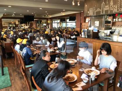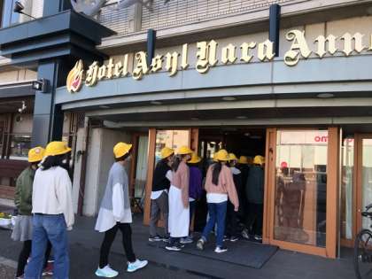 バスで45分ほどかけて奈良市内の昼食場所まで移動しました。場所はホテルです。中はとてもおしゃれで、みんな盛り上がっています。