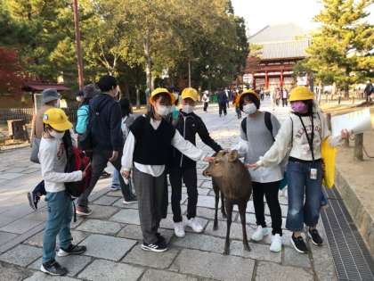 東大寺の大仏殿の中の班別研修の様子です。外に出ると鹿がたくさんいます。さっそく鹿と戯れています。