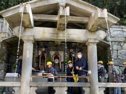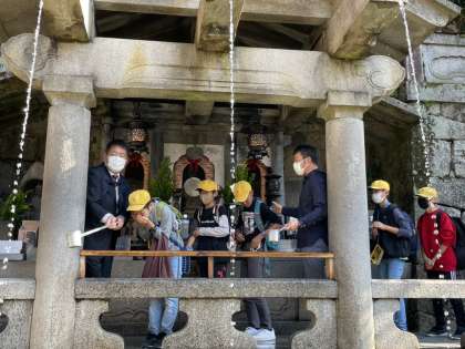 音羽の滝の様子です。こちらは2組です。2組は学問成就を願う児童と長寿を願う児童が半々ぐらいでした。