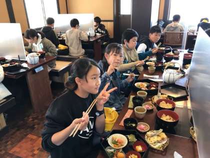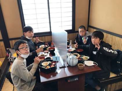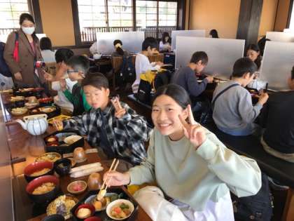 清水寺の見学を終えて、昼食会場へ移動しました。13時15分ごろでみんな「お腹がすいたー」と言ってます。用意されていた食事にみんな大喜び。「この天ぷらはこれまでに食べた中で1番おいしい」と言っている子もいます。
