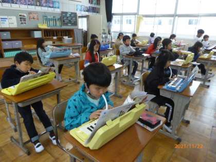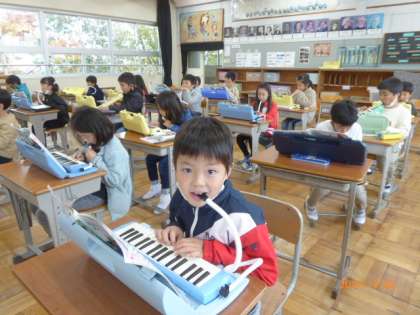2年1組は音楽の時間です。鍵盤ハーモニカで「こぎつね」を演奏しています。ただ音が出ればいいというだけでなく、鍵盤ハーモニカの支え方、吹き口のくわえ方、姿勢についても先生が注意しています。