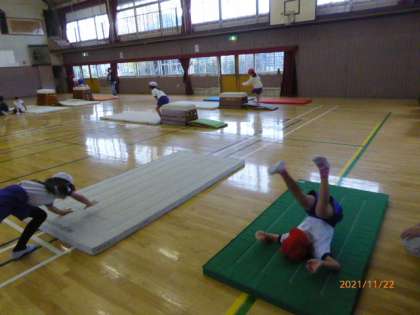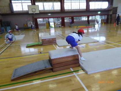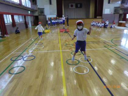 1年生のジャングルたんけんの続きです。赤と白に分かれてリレーをしています。