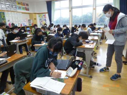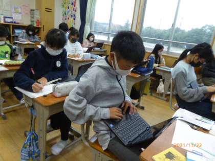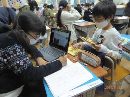 6年2組は国語の授業で文化を発信することを目的にパンフレットづくりをしています。テーマに選んだのは修学旅行です。修学旅行で学んだことを、国語の勉強として表現しています。