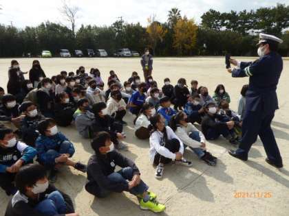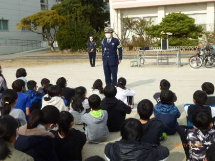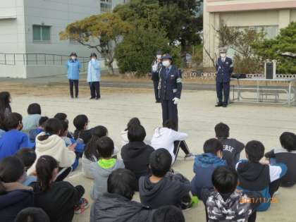 最後の児童が到着し、すで訓練を終えていた6年生が運動場にもう一度集合しました。警察の方からしっかりとできたことをほめていただきました。また、サービスで警察手帳を見せてくださいました。最後に全員でお礼を言いました。