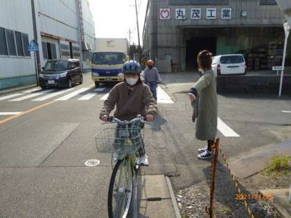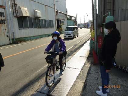 押しボタン信号を渡ったら常滑街道を走ります。ここはトラックや自動車がよく通るうえに、歩道がなく大変危険です。駐車場から出てくる車もあります。保護者のみなさんが気をつけてくれています。