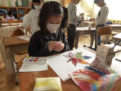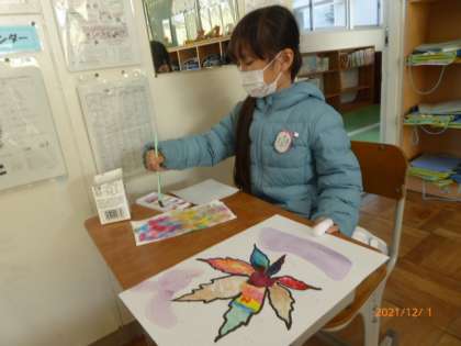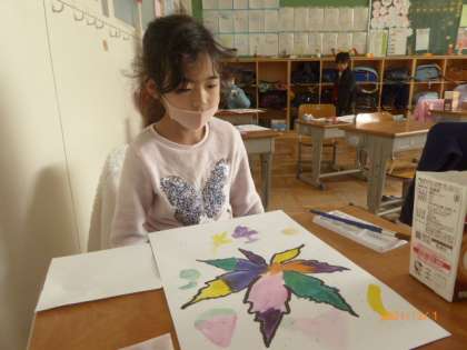 2年1組の「もみじをぬってみよう」の続きです。1枚の葉のなかでグラデーションになっている子もいます。素晴らしいね!