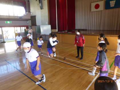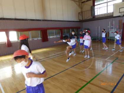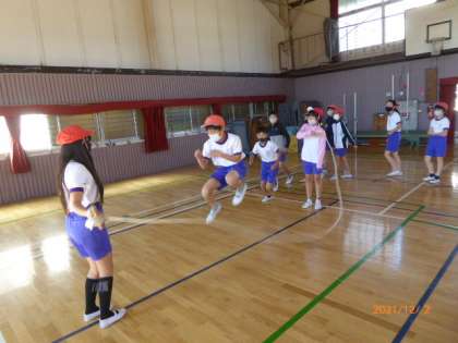 4年1組は長なわの練習をしています。8の字跳びです。とても速いテンポで、スピーディーに走り抜けていきます。立ち止まってなわを待ってとぶのでなく、走り込んで素早くとんでなわをかわして走り抜けるイメージです。