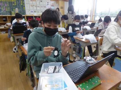 6年1組はプログラミング実験器を使ってプログラミングの勉強をしています。タブレットと実験器を指示に従って接続します。タブレット上で命令を書き込んで実行すると、実験器が光ったり音を出したりできます。