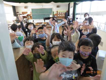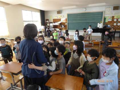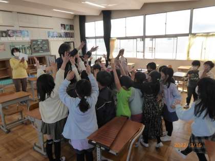 1年生のありがとうを伝えようの続きです。演奏が終わりました。すてきな演奏にお礼を言いました。終わったあとで、担任の先生は子どもたちに囲まれています。