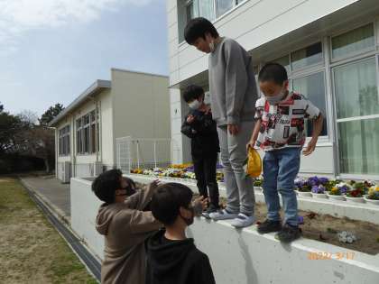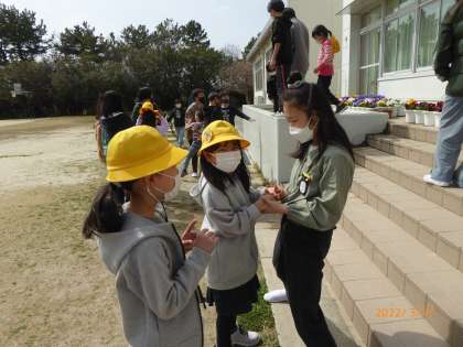 1年生と6年生が名残惜しそうに遊んでいます。もうお別れですね……