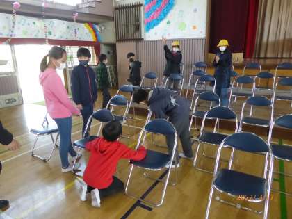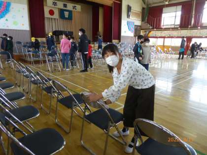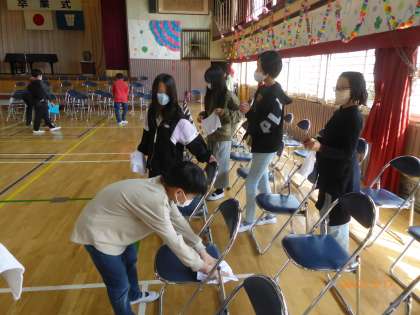 卒業式準備の続きです。きれいになった体育館にもう一度椅子を並べて、雑巾がけをしています。