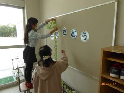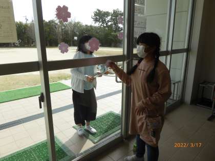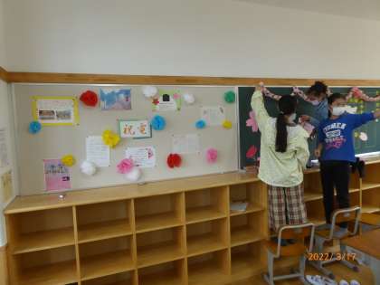 卒業式準備の続きです。新館の昇降口にもきれいな花飾りがつけられました。教室にはお世話になった先生方から届いた祝電が掲示されました。