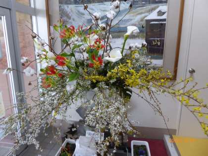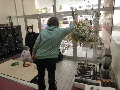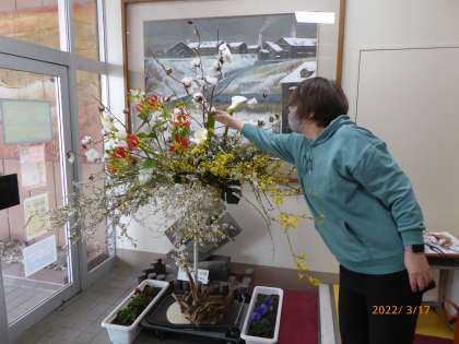 卒業式準備の続きです。玄関には、お花の先生が立派な生け花をつくってくださいました。明日、玄関の外に出して、記念写真スポットにする計画です。
