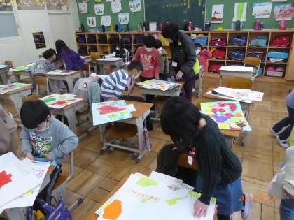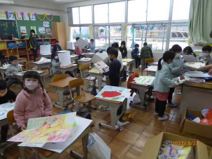 1年生は絵などの図工作品や、作文などを返却しています。がんばったことを思い出しますね。