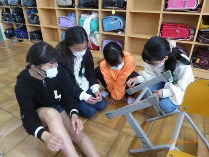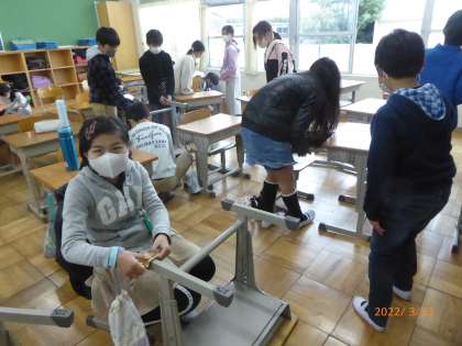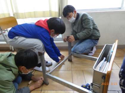 4年1組は机の脚の裏側のほこりを取っています。明日、大掃除がありますが、今日のうちから教室をきれいにしています。