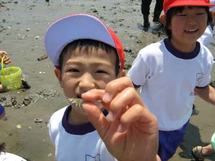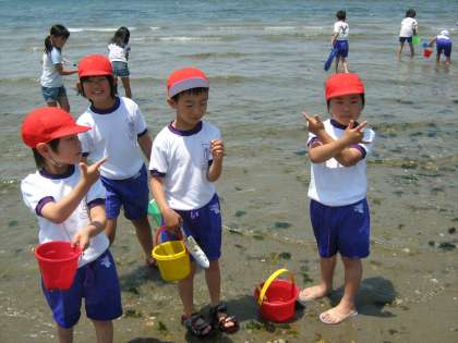 1年生が、3年生と一緒に海で遊びました。あさりややどかりを見つけて、とても嬉しかったです。