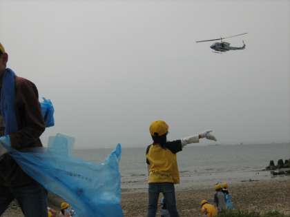 縦割り班ごとに一生懸命働いていると,そこへ,ヘリコプターも飛んできて声援を送ってくれました。