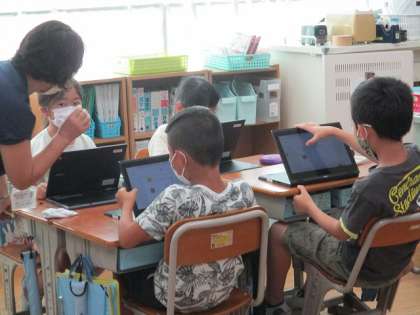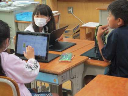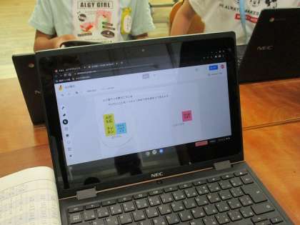 画面を共有して、付箋を貼ったり、字を書いたりできるこの機能は、友だちのかいたものを、すぐに自分のタブレットで見られます。一人ずつ発言していくと全部確認するのにとても時間がかかりますが、このように画面を共有すると、アイディアをどんどん書き込め、友だちのアイディアも同時に確認できるので、発言が苦手な子も、抵抗なく取り組めるかもしれません。