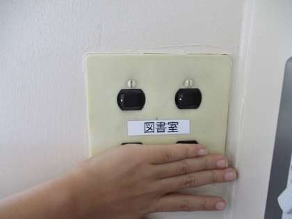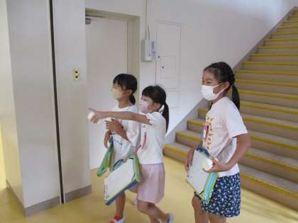図工「ともだち見つけた!」で、いろいろな場所を歩き、よく見ると顔に見える場所を探しています。