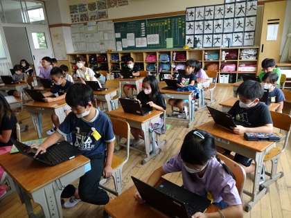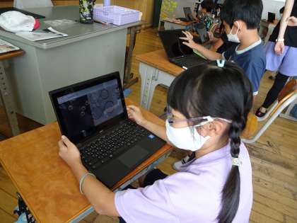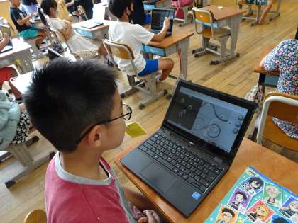 3年2組はプログラミングの体験をしています。「ビスケット」というプログラムを使って、イラストを動かす体験です。めがねの形をした枠の中で、イラストをずらして並べるだけで、それが連続した動きとなって表示されるという仕組みです。みんな「おお!」と感動しながら楽しんでいます。
