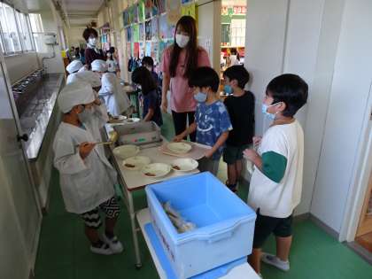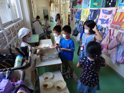 4時間目が終わって1年生の教室へ行くと、給食準備が始まっています。廊下で給食当番が分量を考えながら盛り付けています。一方通行でそれを受け取って自分の席まで運んでいます。とってもスムーズです。