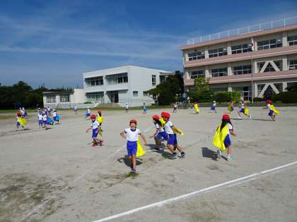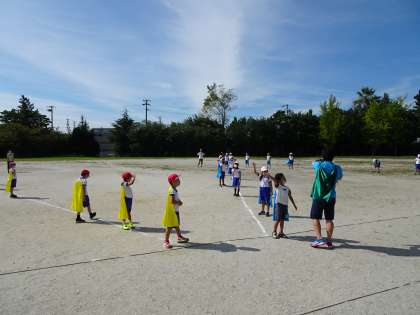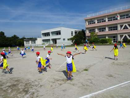 2年生は運動会にむけて、運動場でダンスの位置の確認をしています。2曲踊るので、隊形移動の確認もしました。